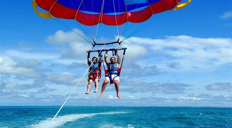 You’ll be lifted gently into the air by a parachute attached to a speedboat, flying up to 150 meters over the sparkling turquoise water. The view is breathtaking — you can see the coastline, coral reefs, and nearby islands from a whole new perspective.
